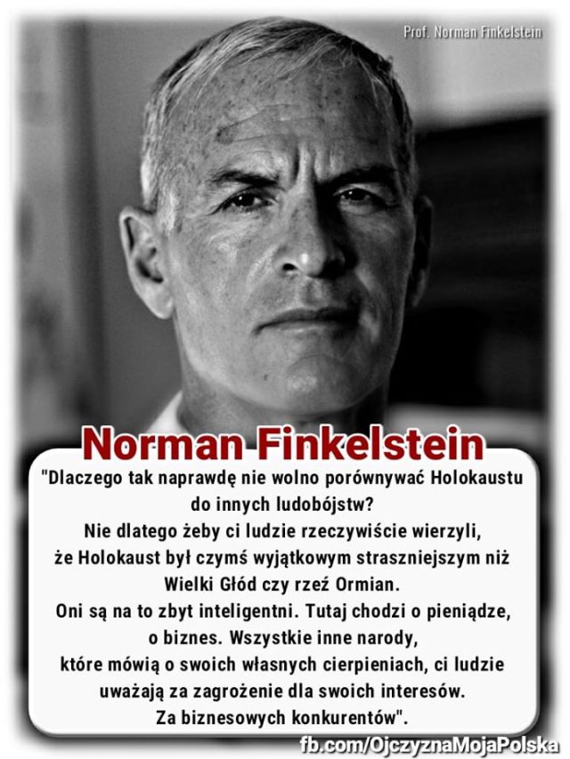 „Dlaczego tak naprawdę nie wolno porównywać Holokaustu do innych ludobójstw? Nie dlatego żeby ci ludzie rzeczywiście wierzyli, że Holokaust był czymś wyjątkowym straszniejszym niż. Wielki Głód czy rzeź Ormian. Oni są na to zbyt inteligentni. Tutaj chodzi o pieniądze, o biznes. Wszystkie inne narody, które mówią o swoich własnych cierpieniach, ci ludzie uważają za zagrożenie dla swoich interesów. Za biznesowych konkurentów”.