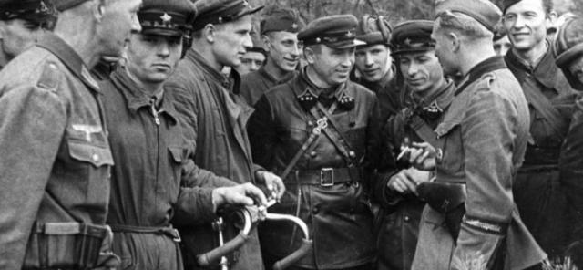 20 wrzesień 1939 r. Pierwsze spotkanie wojsk niemieckich i rosyjskich. Niemieccy żołnierze rozmawiają z radzieckimi oficerami w pułku czołgów Armii Czerwonej na wschód od Brześcia Litewskiego. Odpowiadają na wizytę sowieckiego komisarza Borowieńskiego u dowódcy XIX w tym samym dniu. Korpus wojskowy Heinz Guderian w Brześciu Litewskim.