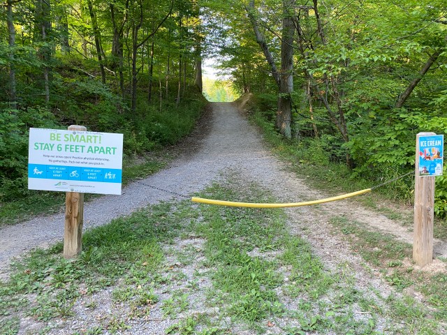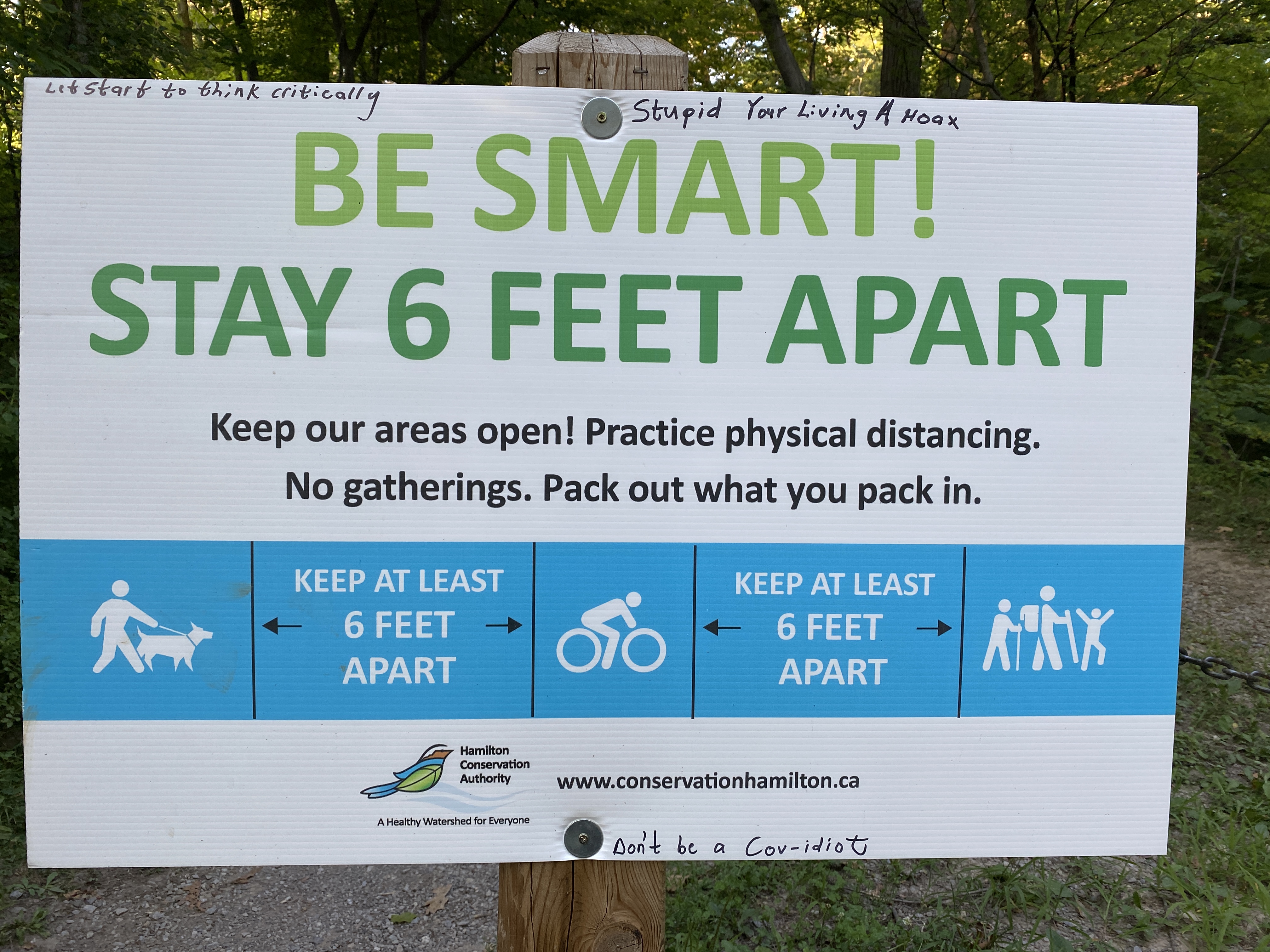 Zarząd rezerwatu wywiesił tablicę zalecającą utrzymywanie 6 stóp odległości między ludźmi. Ktoś dopisał trzy uwagi: