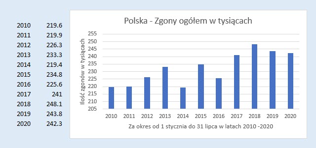 Chcę tu zaznaczyć, że w bazie danych GUS brakuje informacji o ogólnych zgonach w lipcu, i sierpniu 2020 roku, choć uprzednio takie informacje były publikowane w środku następnego miesiąca. Dane za lipiec 2020 znalazłem w jakimś opracowaniu Ministerstwa Cyfryzacji – i to przez „trzecią” stronę internetową.
