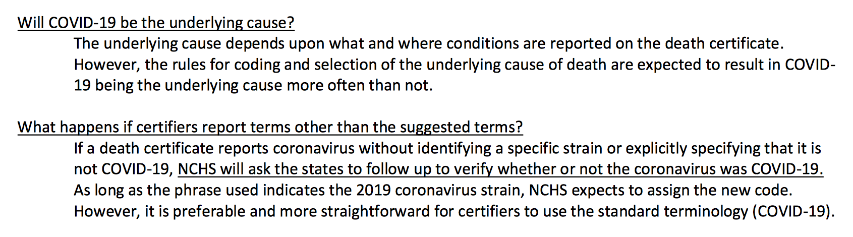 Jeśli akt zgonu zgłasza koronawirusa bez identyfikowania konkretnego szczepu lub wyraźnie określając, że nie jest to COVID-19, NCHS poprosi stany o dalsze działania w celu sprawdzenia, czy koronawirusem był COVID-19.