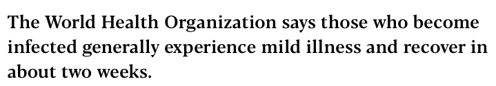 „… Ogólne konsekwencje kliniczne Covid-19 mogą ostatecznie być bardziej zbliżone do ciężkiej grypy sezonowej (która ma śmiertelność około 0,1%) lub grypy pandemicznej (podobnej do tych w 1957 i 1968), niż do choroby podobnej do SARS lub MERS, w przypadku których wskaźniki śmiertelności wynosiły odpowiednio 9–10% i 36%.”