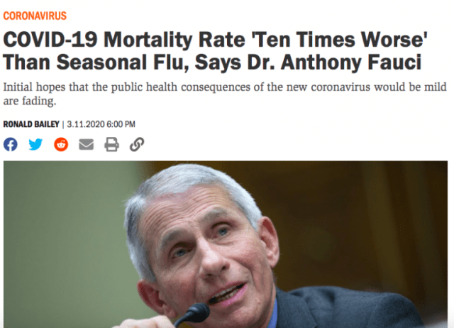 Dr Anthony Fauci okłamuje sam siebie. W swoich publicznych wypowiedziach jednocześnie mówi, że Covid jest „dziesięć razy gorszy od grypy sezonowej”. Odrzuca swój recenzowany raport, cytowany powyżej. Od samego początku Fauci odegrywa kluczową rolę w prowadzeniu kampanii strachu i paniki w całej Ameryce: