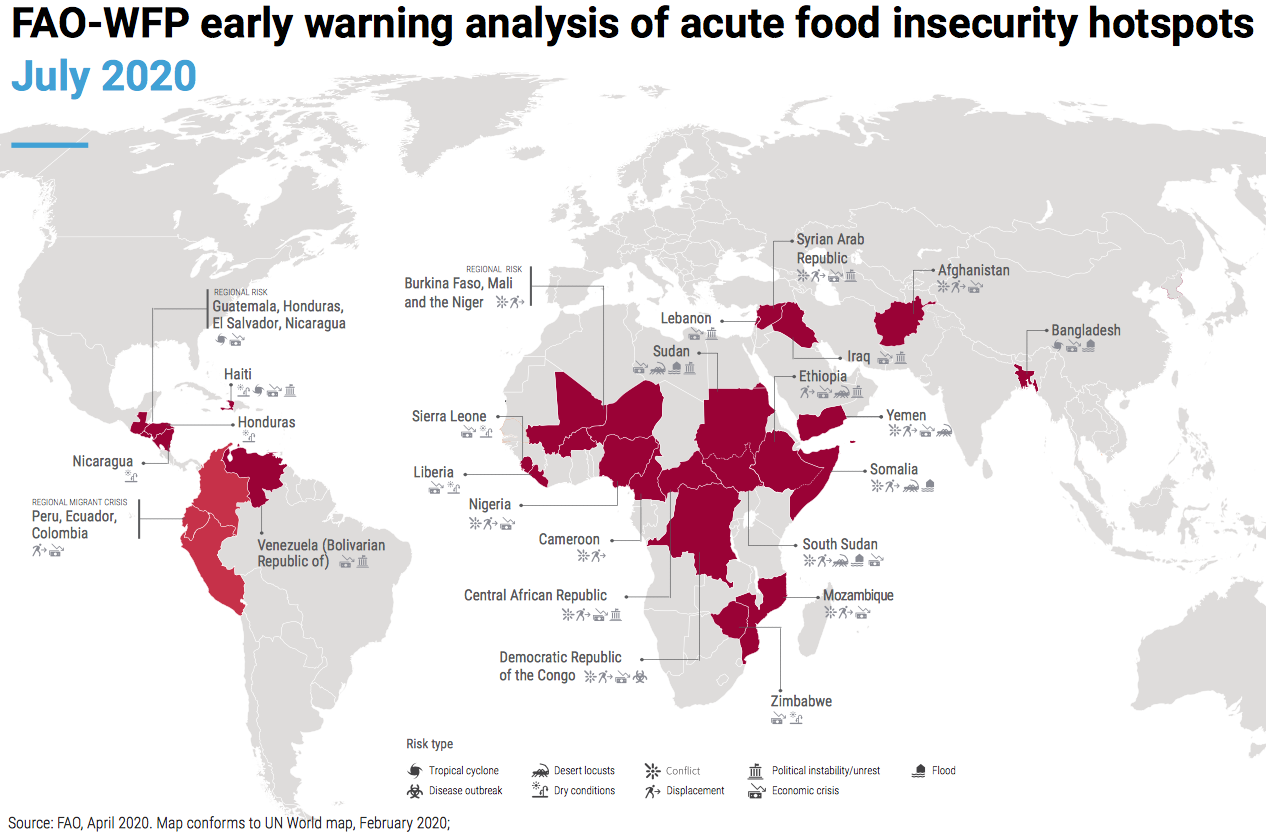 Agencja Organizacji Narodów Zjednoczonych ds. Wyżywienia i Rolnictwa (FAO) oraz Światowy Program Żywnościowy (WFP) identyfikują 27 krajów, które znajdują się na pierwszej linii zbliżającego się kryzysu żywnościowego wywołanego przez COVID-19, ponieważ efekt domina pandemii pogarsza istniejące wcześniej czynniki powodujące głód.