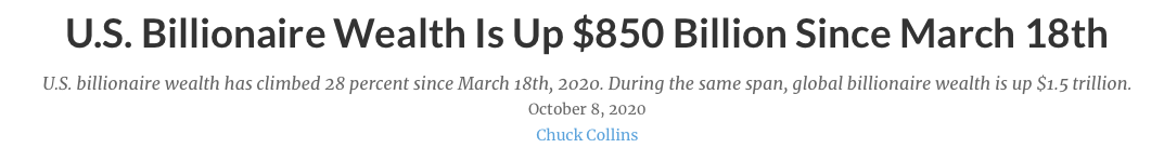 Łączne bogactwo amerykańskich miliarderów wzrosło o 850 miliardów dolarów od 18 marca 2020 roku, co oznacza wzrost o ponad 28 procent. (Szacunek ten nie uwzględnia wzrostu zamożności w okresie poprzedzającym 18 marca, który charakteryzował się serią krachów na giełdzie).