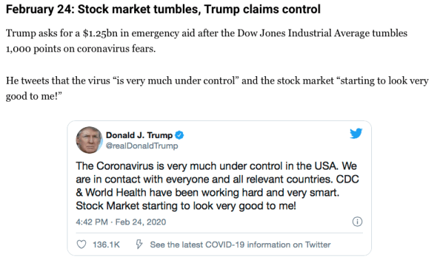 W poniedziałek, 24 lutego, po ponownym otwarciu giełd, nastąpił bezprecedensowy spadek kursu Dow Jones, który można przypisać „zbliżającym się niebezpieczeństwom”, że „Covid rozprzestrzenia się na całym świecie, powodując niepewność na rynkach finansowych”.