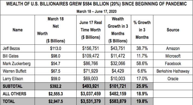 Poniższa tabela przedstawia wzrost majątku osobistego pięciu najbogatszych miliarderów w USA (18 marca – 17 czerwca 2020). (Nie zaznaczono w tabeli, majątek amerykańskich miliarderów wzrósł o kolejne 266 miliardów dolarów od czerwca do października 2020 roku).