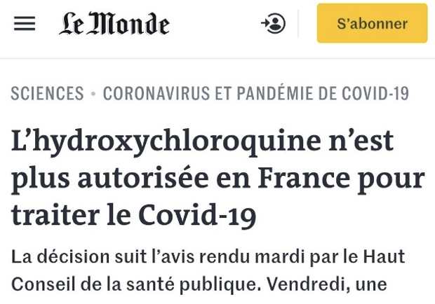 Wykorzystaliśmy ją na początku (marzec 2020 r.) w hospitalizacji i intensywnej terapii, aby w obliczu polemiki i zakazu ze strony wysokich władz zdrowotnych bardzo szybko ją porzucić. Jak zostało dobrze wykazane, hydroksychlorochinę należy wprowadzić wcześnie, od pierwszego dnia objawów, kiedy obciążenie wirusowe jest ważne i kiedy wirus nie wniknął jeszcze do płuc!