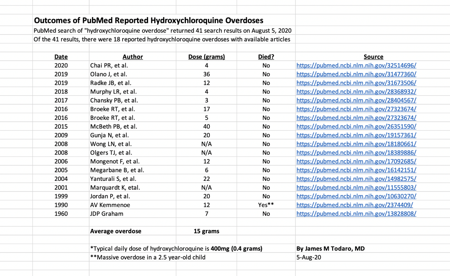 W latach 1960–2020 wyszukiwanie w PubMed (witryna archiwum medycznego), w którym szukano „przedawkowanie hydroksychlorochiny”, wykazało „tylko” 18 przypadków przedawkowania wraz z odpowiednimi artykułami. Dawki znacznie przewyższały zalecane, tym bardziej zalecane w leczeniu zakażenia COVID-19, czyli 400 mg / dobę przez 5 dni. Pomimo tych bardzo nadmiernych dawek, w tych 18 przypadkach odnotowano tylko 1 zgon i obejmował on masywne przedawkowanie (12 g) u 2,5-letniego dziecka.