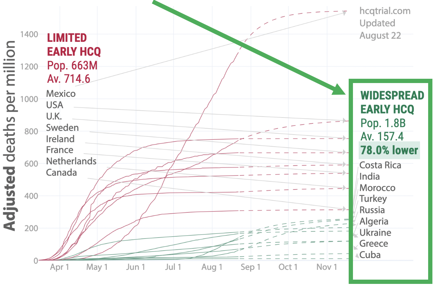 – „Te siedem badań obejmuje: 405 pacjentów z grupy wysokiego ryzyka leczonych przez dr Vladimira Zelenko, z zerową liczbą zgonów (i bez zaburzeń rytmu serca); cztery badania obejmujące łącznie prawie 500 pacjentów z grupy wysokiego ryzyka leczonych w domach opieki dla osób starszych i klinikach w całych Stanach Zjednoczonych – bez zgonów; badanie kontrolne z udziałem ponad 700 pacjentów wysokiego ryzyka w Brazylii, ze znacznie zmniejszonym ryzykiem hospitalizacji i dwoma zgonami spośród 334 pacjentów leczonych hydroksychlorochiną (a wśród 412 pacjentów leczonych HCQ, bez arytmii serca); i inne badanie z 398 dopasowanymi pacjentami we Francji, również ze znacznie zmniejszonym ryzykiem hospitalizacji (wśród 1061 pacjentów leczonych w Marsylii brak arytmii serca). – Więcej informacji można znaleźć w http: / /www.francesoir.fr/opinions-tribunes/la-cle-pour-vaincre-la-covid-19-existe-deja-nous-devons-commencer-lutiliser