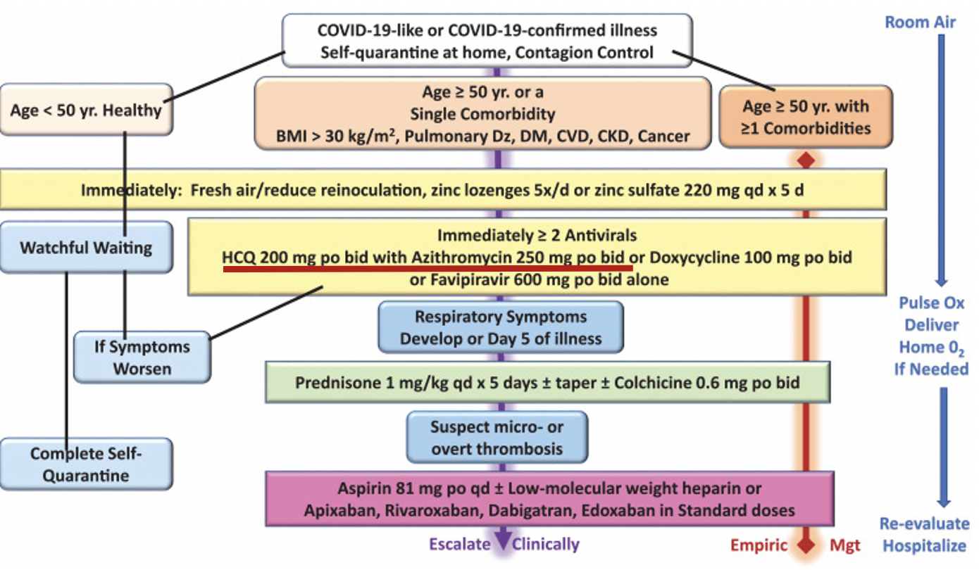 Zatem hydroksychlorochina w leczeniu zakażenia COVID-19 daleka jest od bycia jedynie interwencjami czy badaniami zespołu profesora Didier Raoult w IHU-Méditerranée w Marsylii. W rzeczywistości, w niedawnym American Journal of Medicine (AJM) z 6 sierpnia 2020 r., https://www.amjmed.com/article/S0002-9343(20)30673-2/fulltext (plik PDF do pobrania) przedstawiono schemat terapeutyczny ponownie, z hydroksychlorochiną w dobrym i właściwym miejscu, połączoną z azytromycyną: