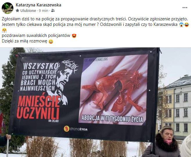 Problem w tym, że p. Katarzyna wydaje się oburzona widocznym na zdjeciu plakatem, zapominając o tym, że sama promuje i broni prawa kobiet do aborcji. Naprawdę trudno zrozumieć taką hipokryzję.