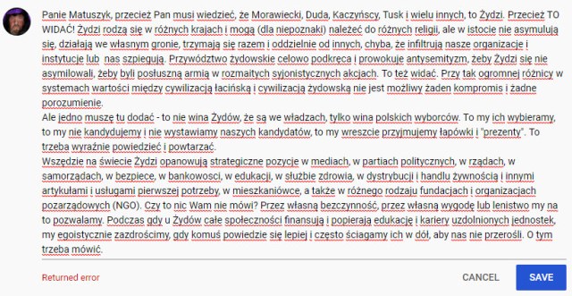 Pod tym wywiadem na YouTubie umieściłem komentarz. Gdy kilka sekund później chciałem coś do niego dodać, okazało się, że nie można, bo komentarza już nie ma. NIe wiem czy tą cenzurę zastosował YouTube, czy Media Narodowe, ale taki przypadek nie zdarzył mi się po raz pierwszy i daje dużo do myślenia. Czyżby chłopcy zapraszali p. Matuszyka, aby skompromitować „prymitywnego, antysemickiego Polaka”? Wszystko możliwe, bo przecież w MN, w wrealu i w Konfederacji też widać liczebną przewagę tych, o których w tym wywiadzie mowa. A to, że nam mówią co się zbliża, to mośe być zawór bezpieczeństwa dla opuszczenia ciśnienia i powolne przyzwyczajanie nas do tego co dla nas planują, tak aby nagła zmiana nie doprowadziła do gwałtownych protestów i rozruchów. – (Tak tylko sobie „głośno myslę” choć mam nadzieję, że się mylę).