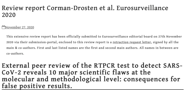 Opublikowany protokół RT-qPCR do wykrywania i diagnostyki 2019-nCoV oraz manuskrypt zawierają liczne błędy techniczne i naukowe, w tym niewystarczający projekt startera, problematyczny i niewystarczający protokół RT-qPCR oraz brak dokładnej walidacji testu. Ani prezentowany test, ani sam manuskrypt nie spełniają wymogów dopuszczalnej publikacji naukowej. Ponadto nie wspomniano o poważnych konfliktach interesów autorów. Wreszcie, bardzo krótki czas między złożeniem a przyjęciem publikacji (24 godziny) oznacza, że albo nie przeprowadzono tu systematycznego procesu recenzowania, albo jego jakość jest problematyczna. Dostarczamy przekonujących dowodów na kilka naukowych nieścisłości, błędów i wad. (27 listopada 2020, Krytyka Artykułu Drostena, podkreślenie dodane).