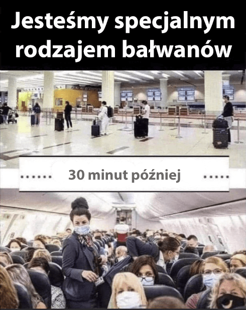 I do tego wszyscy ci ludzie są w pełni zaszczepieni, inaczej nie wpuszczono by ich do samolotu. I wszyscy w maseczkach. Znaczy, nie wierzą w skuteczność szczepionki? Ani oni, ani zarząd lotniska i linii lotniczych? Ani rząd, który zaleca takie Inteligentne Rozwiązania? Smutne to ale prawdziwe…