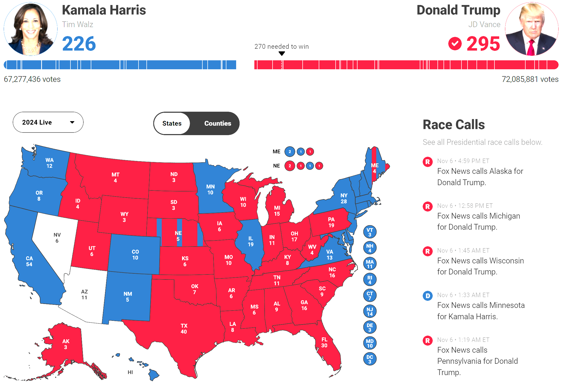 Dwa stany, Arizona i Newada, jeszcze nie zostały oznaczone kolorami ponieważ ciągle trwa tam liczenie głosów. W obu, na tą chwilę, prowadzi Trump, ale to już nie ma znaczenia. Nawet gdyby Kamala wygrała te dwa stany, to i tak nie wygra wyborów.